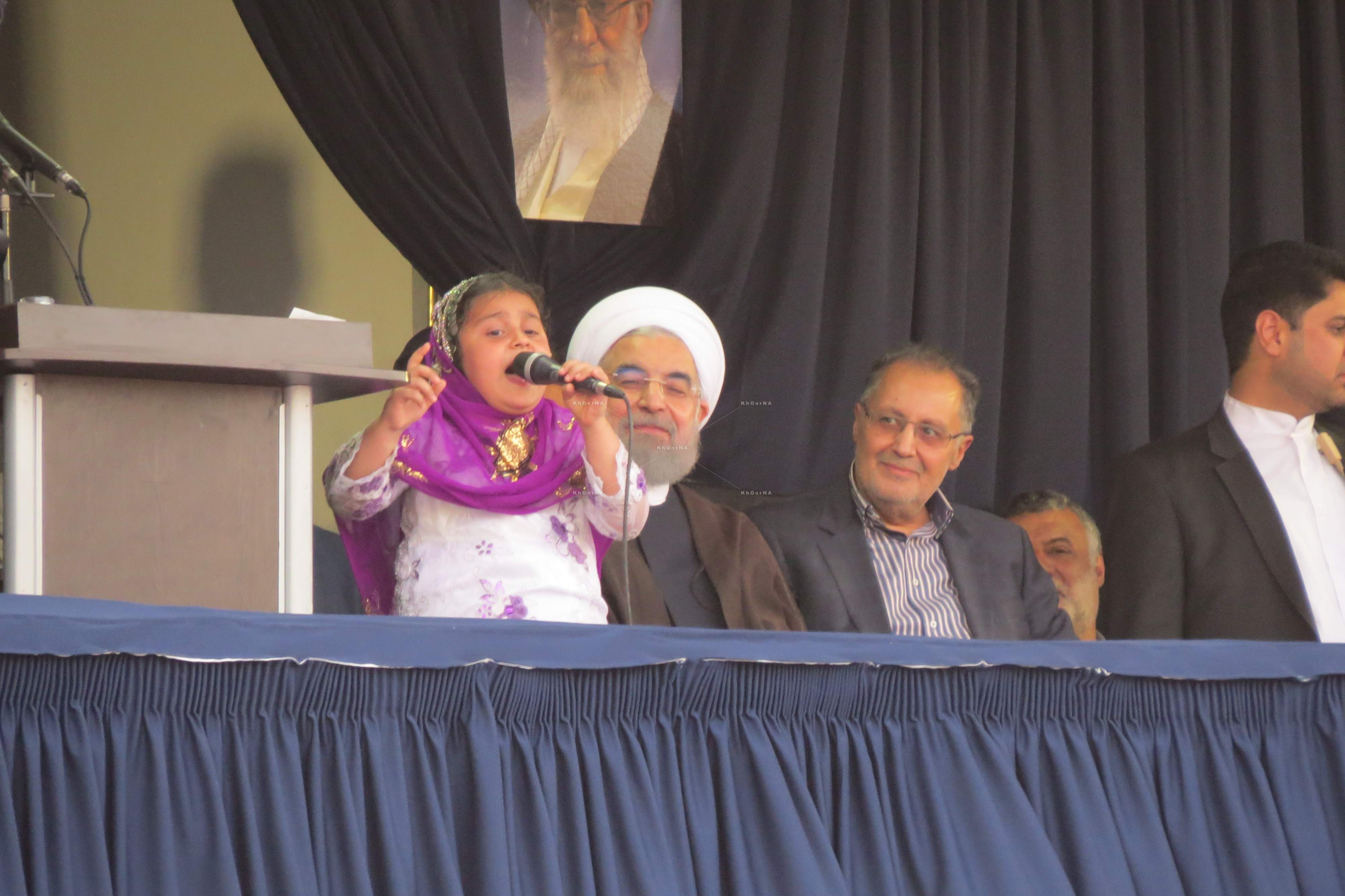 گفتنی است از دیگر نکات جالب توجه این مراسم شعرها، سرودها و دستنوشتههای زیبایی بود که در حین سخنرانی دکتر روحانی توسط حضار با یک هماهنگی مثالزدنی سروده، اجراء و به نمایش گذاشته میشد که از آنجمله میتوان به سرود یاردبستانی، شعر «ما که هوا نداریم ولی هواتو داریم » و پلاکارتهایی با مضمون «خوزستان یک کلام، روحانی وسلام» اشاره کرد.