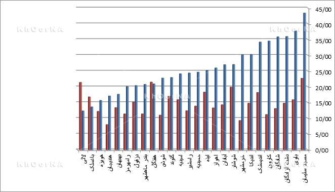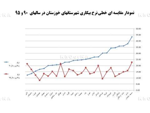 - نمودار مقایسهای میلهای نرخ بیکاری شهرستانهای خوزستان در سالهای ۹۰ و ۹۵