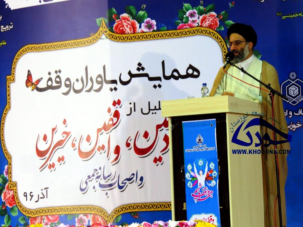 در این همایش حجتالاسلام سید محمد طباطبایی مدیر کل اوقاف خوزستان و همچنین حجتالاسلام عبدالحسین شوشتری نسب مسئول نمایندگی ولی فقیه در فرودگاههای استان در باب فضایل وقف و آثار و برکات آن در زندگی فردی و اجتماعی انسان بر طبق آیات و روایات اسلامی سخنانی چند ایراد کردند.