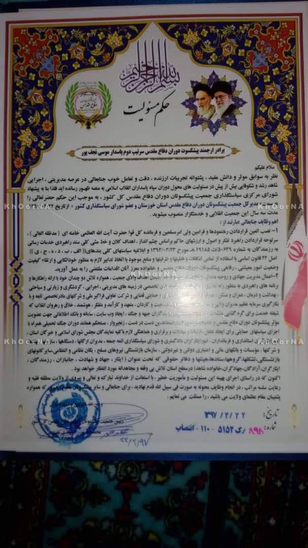 میثاق حاجتی| خورنا: انتصاب سردار نجف پور به سمت مدیرکل جمعیت پیشکسوتان دوران دفاع مقدس استان خوزستان.