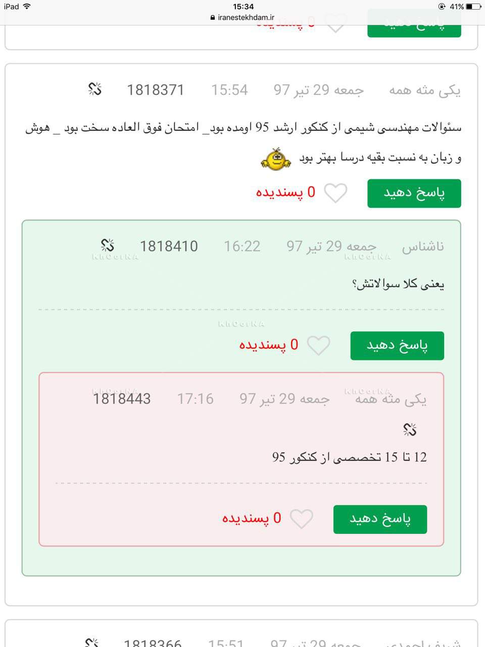 نکته جالب اینکه یک کاربر به نام الهه از فردی که کپی بودن آزمون از آزمون ارشد ۹۵ و ۹۶ را در امتحان صبح داده بود تشکر کرده است.