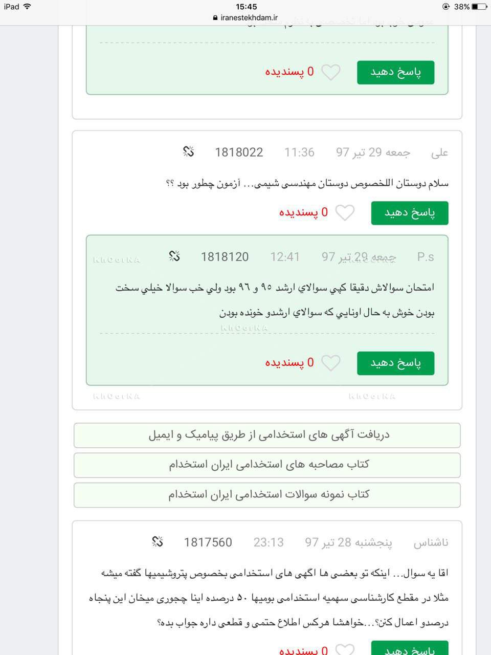 • بیکار واقعا متاسفم که جوونای مملکت ما چرا اینقدر درک و قبول شکست واسشون سخته و فقط پشت بن بست اعتراض قایم میشن آقایون و خانم ها طراح سوال از هر جا دوست داره میتونه سوال بده به هیچ کسی هم مربوط نیست اینکه اومده از سوالات ارشد داده که یه مزیت حساب میشه نه عیب. کسی ک سوالات اخیر ارشد رو نگاه نکرده نباید اصلا بیاد سر جلسه. من ۶ امین ازمون استخدامیم هستش و هر بار تمام سوالات ارشد رو حل میکنم ولی ایندفه خدا کمک کرد تونستم درصد بالایی بزنم. شرایط برای همه مساوی بوده و کمکاری خودتونو گردن دیگران نیاندازید