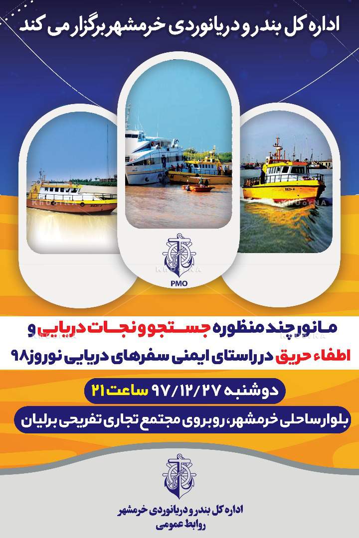 همچنین روابط عمومی اداره بندر و دریانوری از اجرای مانور جستجو و نجات دریایی امشب در بلوار ساحلی خرمشهر خبر داد. اداره کل بندر و دریانوردی خرمشهر از همشهریان دعوت کرد در مانور چند منظوره ی جستجو و نجات دریایی و اطفاء حریق در راستای اجرای طرح ایمنی سفرهای دریایی نوروز ۹۸ در روز دوشنبه ۹۷/۱۲/۲۷ ساعت ۲۱ بلوار ساحلی خرمشهر روبروی مجتمع تجاری تفریحی شرکت کنند.