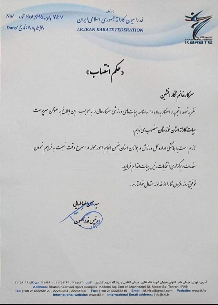 به گزارش خبرگزاری خورنا با حکم سید حسن طباطبایی رئیس فدراسیون کاراته نگار افشین سرپرست جدید هیات کاراته استان خوزستان شد.