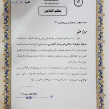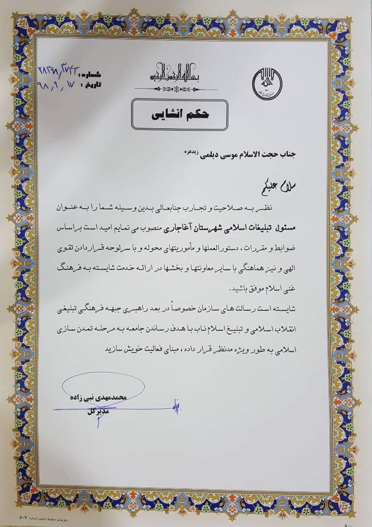 نظر به صلاحیت و تجارب جنابعالی، بدین وسیله شما را بعنوان مسول تبلیغات اسلامی شهرستان آغاجاری منصوب مینمایم. امید است براساس ضوابط و مقررات، دستورالعمل ها و ماموریت های محوله و با سرلوحه قرار دادن تقوی الهی و نیز هماهنگی با سایر معاونت ها و بخش ها در ارائه خدمات شایسته به فرهنگ غنی اسلام موفق باشید.