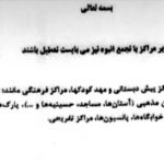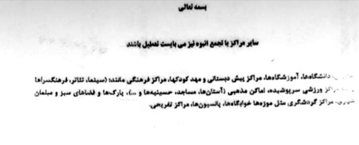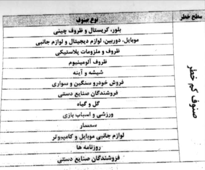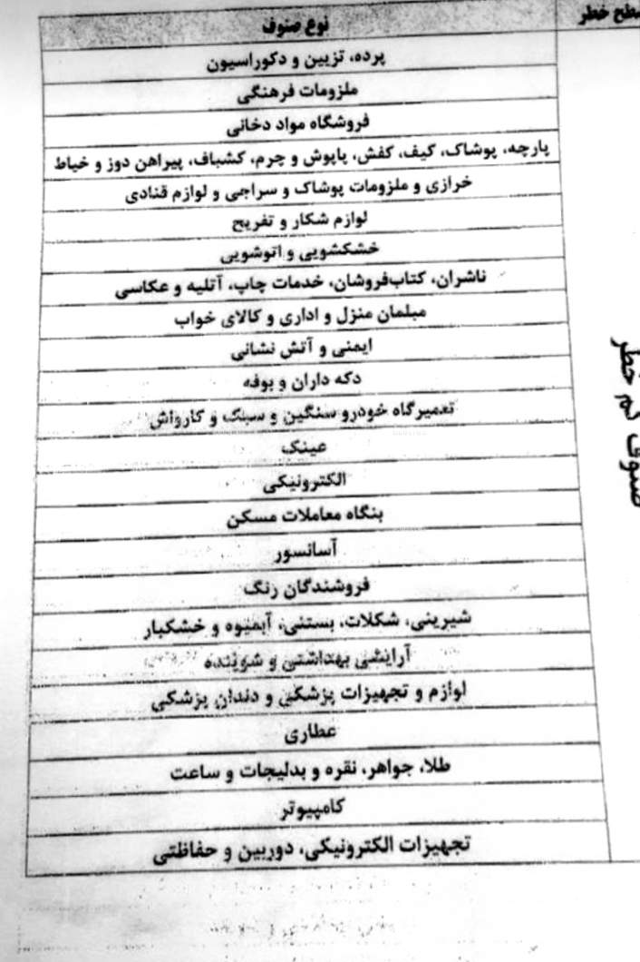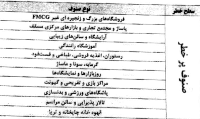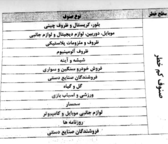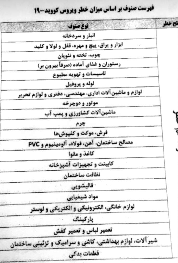 فعالیت صنوف کم خطر از فردا شنبه مورخه ۲۳ فروردین ماه مطابق جداول مشروحه ذیل با رعایت نکات ذیل بلامانع بوده و مشاغل پر خطر کماکان تا اطلاع ثانوی تعطیل و اجازه فعالیت نخواهند داشت.