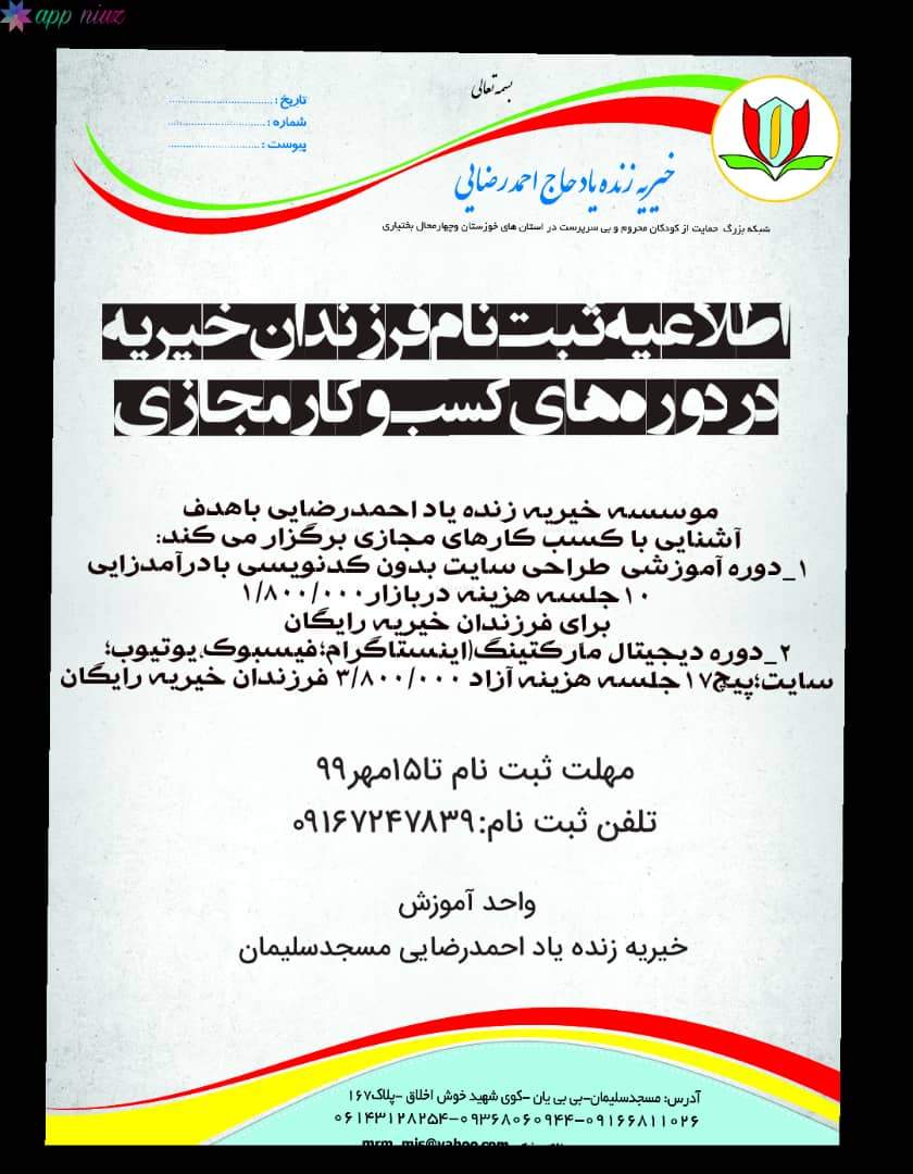با هدف توسعه کسب و کارهای اینترنتی به همت موسسه خیریه زنده یاد احمد رضایی دوره های آموزشی برای فرزندان تحت پوشش این خیریه و نیز کمیته امداد و بهزیستی برگزار میگردد