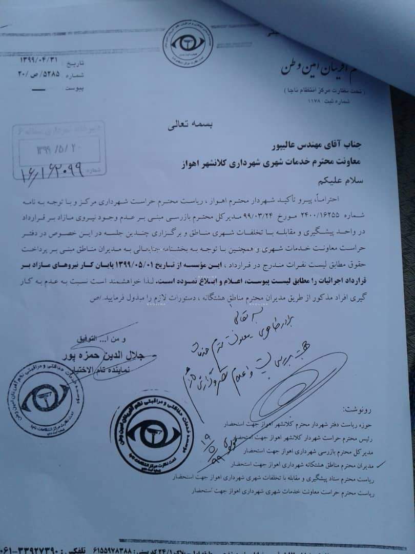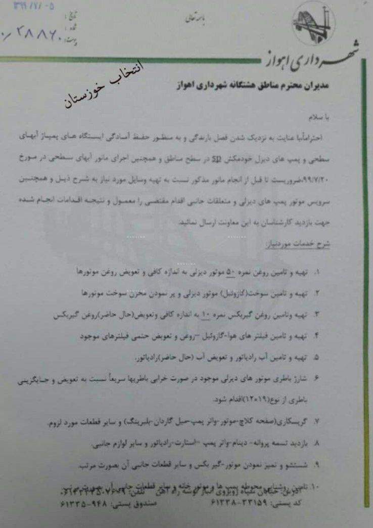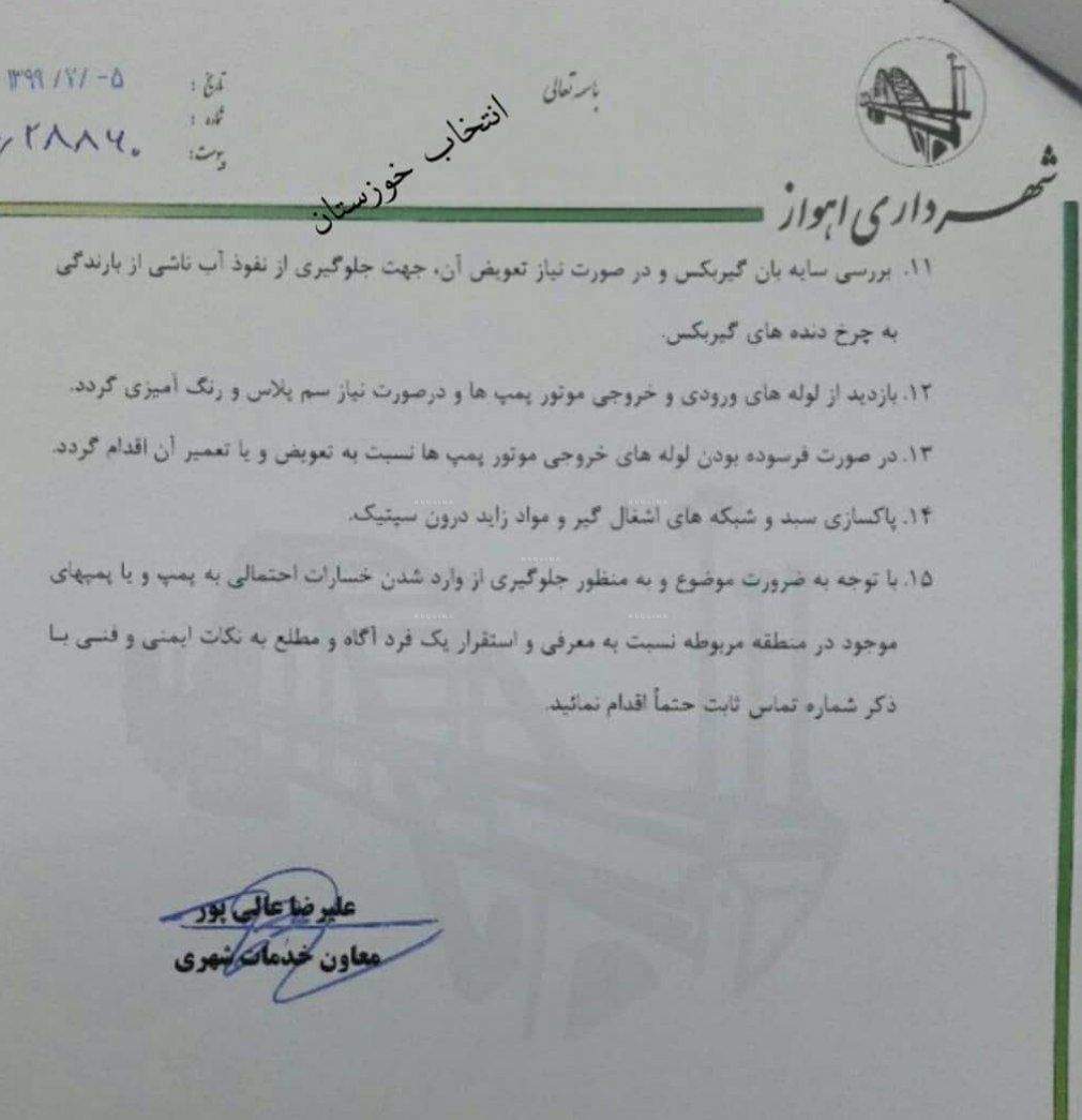 شهردار باتجربه و بی حاشیه وقت (منصور کتانباف) که با ملاحضات سیاسی شورا همسو نبود به بهانه های واهی باهماهنگی همین استاندار کنونی و همین شورای شهر برکنار شد و بازهم باهماهنگی همین تیم مدیریتی یک شخصیت تبلیغاتی فاقد هرگونه تجربه اجرایی به عنوان شهردار (فعلی) اهواز معرفی شد و پروژه های زیرساختی دوران کتانباف از جمله پروژه احداث شبکه دفع آب های سطحی به محاق فراموشی رفت، انتصاب پی در پی مدیران نابلد، مدیریت ارشد شهرداری را از نیروهای فنی خالی کرد، در یک اقدام غیر قابل توجیه استاندار خوزستان به نامه مهم معاون وزیر کشور در مورد فاضلاب اهواز بی توجهی نشان داد (سندشماره۴) و در یک اقدام عجیب تر مانور سالیانه دفع آب های سطحی شهرداری اهواز یک روز پیش از اجرا با تغییر یکباره مدیریت خدمات شهری اهواز به هم می خورد وانجام نمی شود(سندشماره ۵و۶)، مسئله ای که فرماندار اهواز و استاندار خوزستان به عنوان مجریان آن می بایست پاسخگو باشند، سرانجام بحران آبگرفتگی در اهواز را رقم زد، حال بار دیگر می بینیم علی رغم تاکید ریاست محترم قوه قضائیه و اعلام آمادگی همکاری همه جانبه دستگاه قضاء، مسئله ترمیم مدیریت ها در استان خوزستان لوث و مجالی برای فرصت طلبی های جدیدتر ایجاد کرده است.