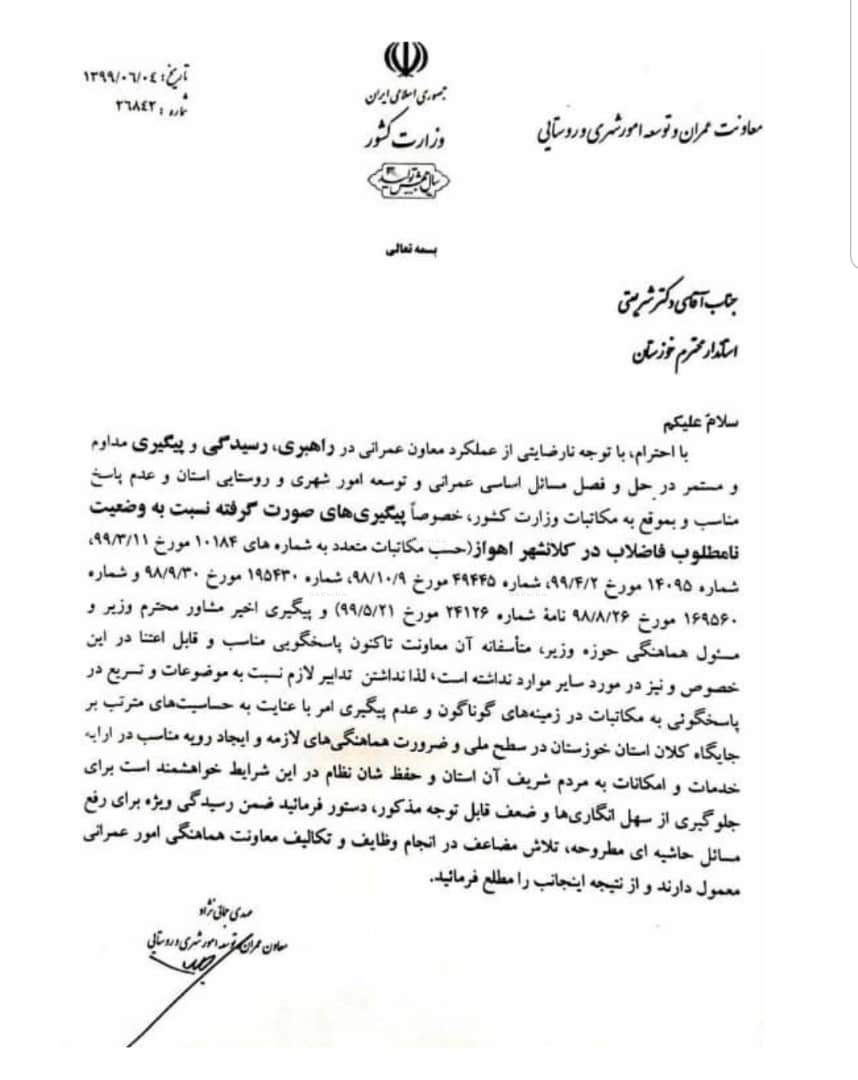 آقای شریعتی استاندار محترم مگر نامه رسمی آقای جمالی نژاد معاونت عمرانی وزیر کشور در تاریخ ۹۹/۶/۴ در خصوص بی اعتنایی آقای عبیات معاونت عمرانی استانداری خوزستان نبود؟
