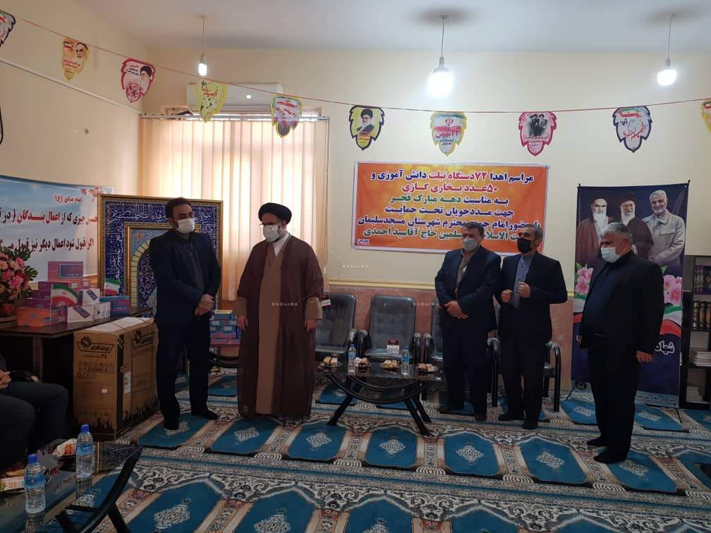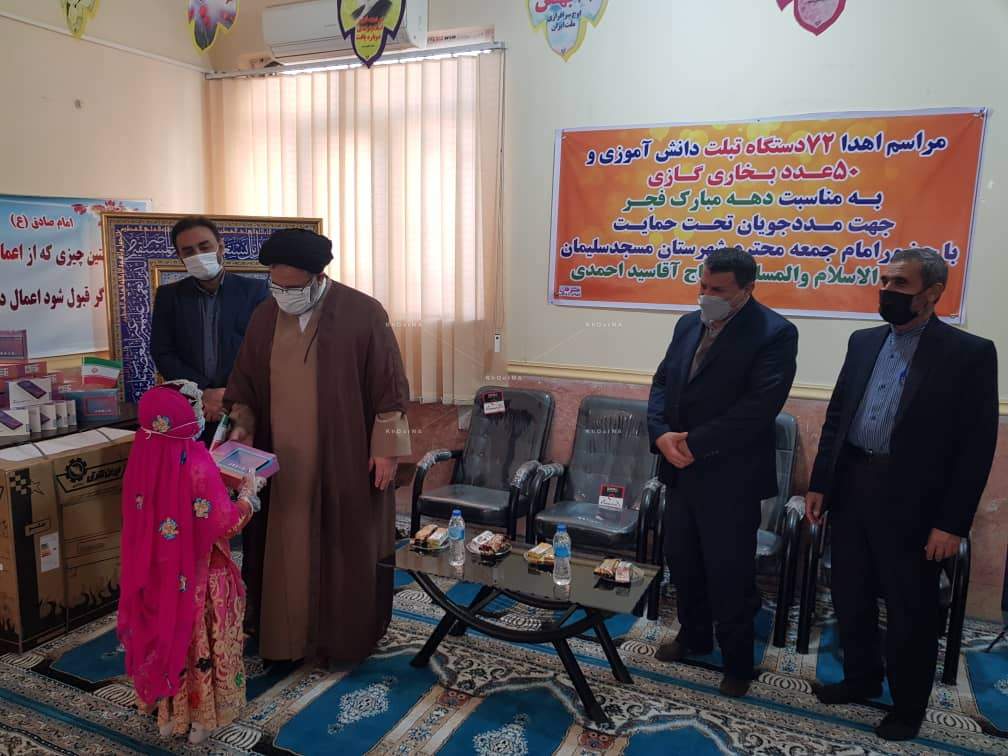 خبرگزاری خورنا : با حضور حجت الاسلام سید احمدی امام جمعه مسجدسلیمان، پژمان منصورنیا رئیس کمیته امداد حضرت امام (ره)،کریمی رئیس دفتر نماینده، نماینده مرکز نیکوکاری احسان ۷۲ عدد تبلت برای دانش آموزان نیازمند تحت پوشش کمیته امداد شهرستان مسجدسلیمان اهداء شد. پژمان منصورنیا رئیس کمیته امداد حضرت امام (ره) در گفتگو با پایگاه خبری رویش زاگرس با اعلام این خبر افزود: این تبلت ها به ارزش ۲۲۸ میلیون تومان و به صورت مشارکتی با خیرین تهیه گردید که مرکز نیکوکاری احسان سهم عمده ای در این مشارکت داشته است. وی گفت: با اهداء ۷۲ عدد تبلت ۲۲۰ دانش آموز توانستند از این طرح برخوردار گردند چرا که بیشتر خانواده ها دو یا سه دانش آموز در خانه داشته اند که به دلیل نداشتن تبلت نمی توانستند در برنامه شاد شرکت نمایند.