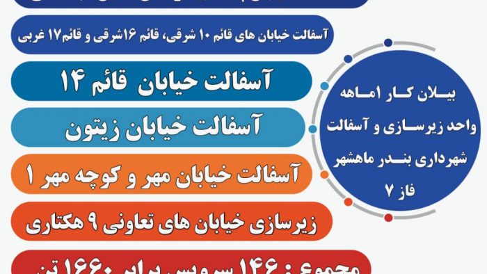 به گزارش خبرگزاری خورنا، مجاهد نظارات، شهردار بندرماهشهر گفت: در این عملیات آسفالت ریزی خیابان های زیتون، قائم۱۴، قائم ۱۰ شرقی، قائم ۱۶شرقی، قائم ۱۷ غربی، خیابان مهر، کوچه مهر ۱ آسفالت شده است.