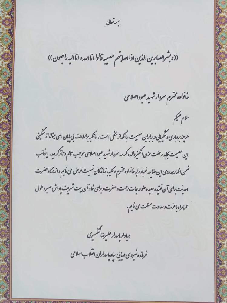 درپی درگذشت والده مکرمه سردار شهید عبود اصلاحی فرمانده سپاه پاسداران انقلاب اسلامی باانتشار پیامی درگذشت این مادر فداکار را تسلیت گفت.
