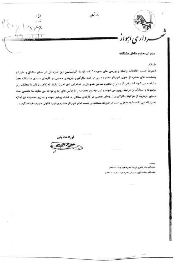روز گذشته نامه ای به دست ما رسیده که در آن بازرسی شهرداری اهواز هر گونه بکارگیری این نیروها را ممنوع کرده است و تاکید داشته با متخلفان برخورد خواهد شد.