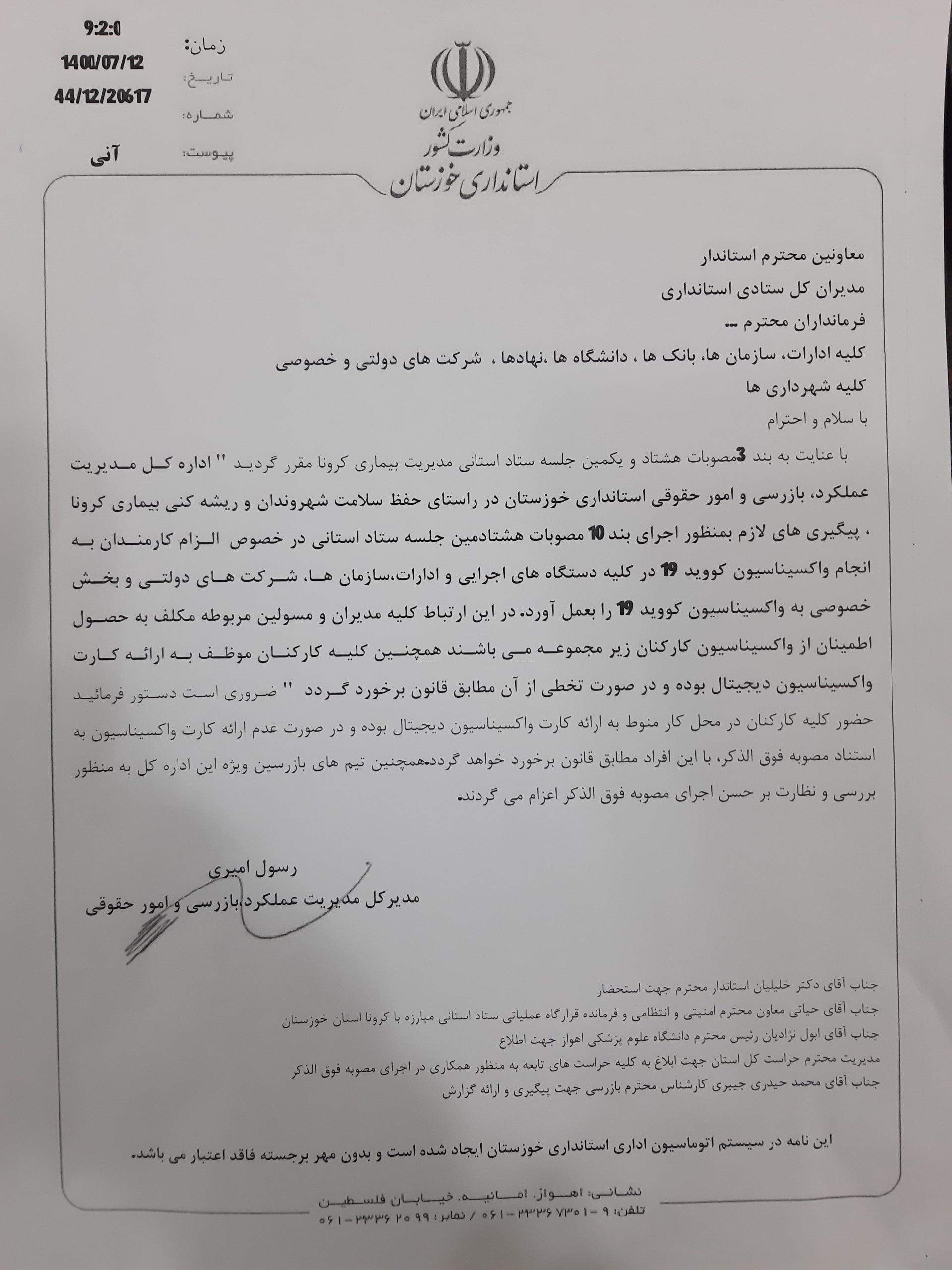 به گزارش خورنا در راستای نامه ۴۴/۱۲/۲۰۶۱۷ مورخ ۱۴۰۰/۷/۱۲ ابلاغی از سوی رسول امیری مدیرکل بازرسی استانداری خوزستان و همچنین بر اساس بند ۱۰ مصوبات هشتادمین جلسه ستاد استانی کرونا کارکنان کلیه دستگاه های اجرایی و ادارات، سازمان ها، شرکت های دولتی و بخش خصوصی ملزم به واکسیناسیون کوید ۱۹ هستند.