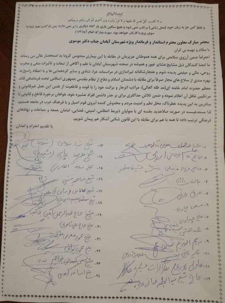 نامه سران عشایر عرب آبادان برای برخورد با رسم تیراندازی در مراسمات
