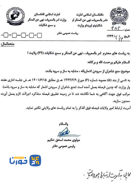 به گزارش خورنا وزارت امر به معروف و نهی از منکر طالبان طی بخشنامهای دستور داده که شاعران از سرودن شعرهایی که «شبیه ساز و سرود» خوانده میشود، خودداری کنند. این مکاتبه در شهریورماه ۱۴۰۱ صادر شده اما تصویر آن اکنون در شبکههای اجتماعی منتشر شده است. طالبان مشخص نکرده که منظور از اشعار «شبیه ساز و سرود» چیست؟