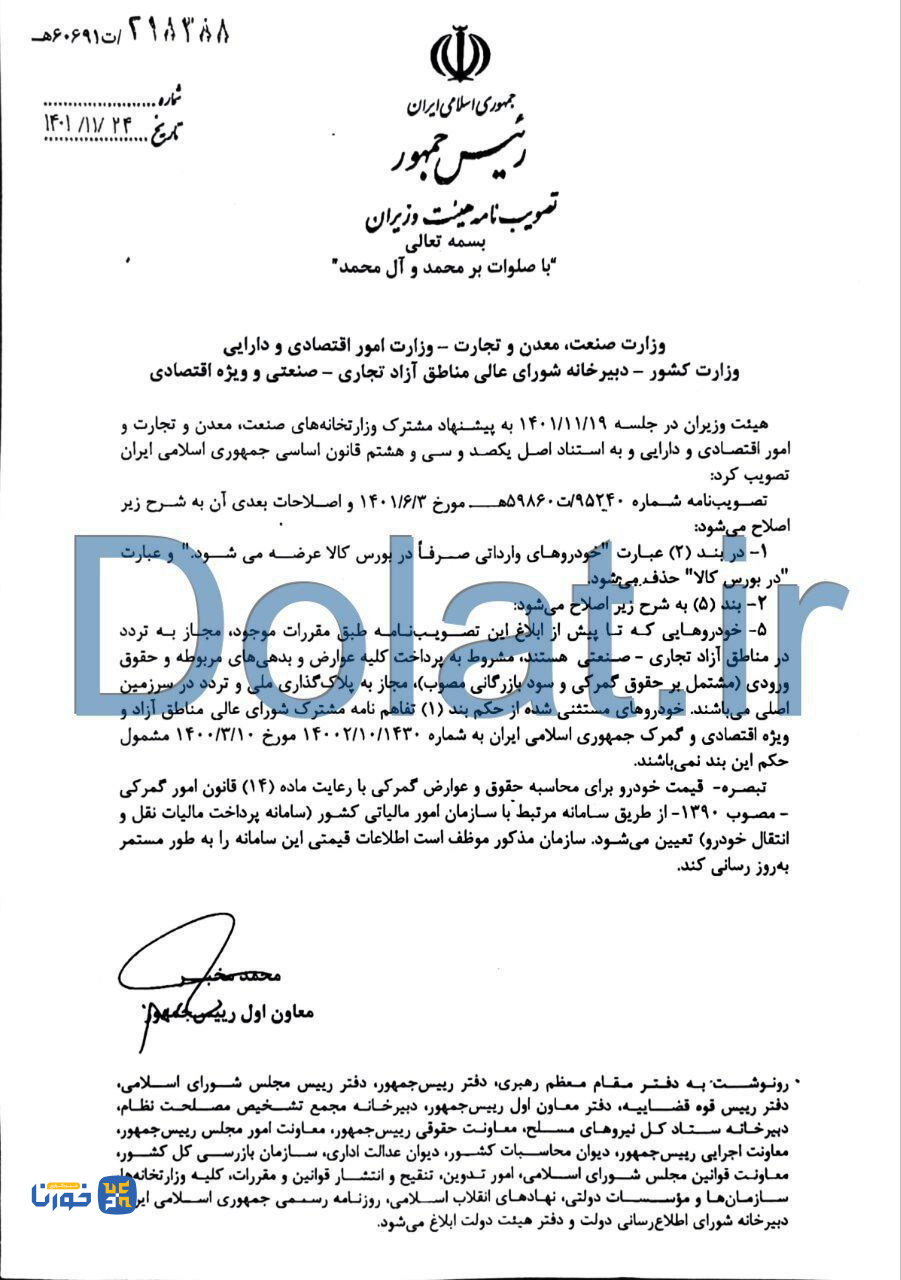 به گزارش خورنا و به نقل از دولت، در متن ابلاغیه محمد مخبر آمده است: خودروهایی که تا پیش از ابلاغ این تصویبنامه طبق مقررات موجود مجاز به تردد در مناطق آزاد تجاری – صنعتی بودهاند، مشروط به پرداخت کلیه عوارض و بدهیهای مربوطه و حقوق ورودی(مشتمل بر حقوق گمرکی و سود بازرگانی مصوب) مجاز به پلاکگذاری ملی و تردد در سرزمین اصلی هستند.
