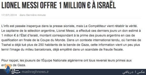 به گزارش مشرق، بازتاب این خبر کذب به حدی بود که امروز رسانه های عربی خبر دادند که مسی با تکذیب این شایعه، از سایت مذکور شکایت کرده و اعلام کرده است که نمیتوان با دولتی که کودکان را میکشد، همدردی کرد.