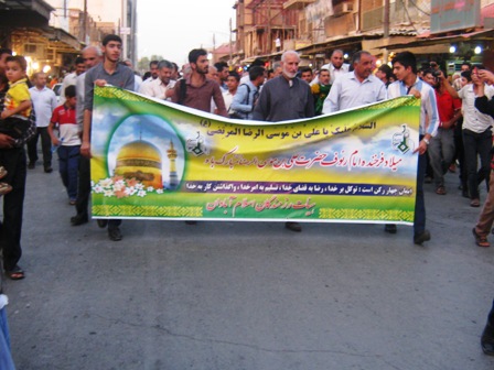 مردم شهرستان آبادان از زن، مرد، پیر و جوان با گل، اسفند و گلاب به استقبال خادمان حرم مطهر حضرت امام رضا(ع) رفتند.