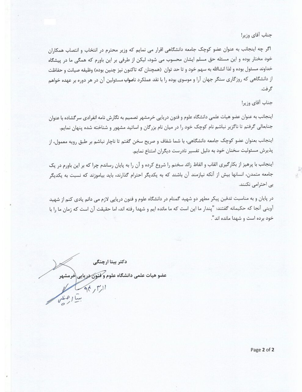 خورنا – این نامه سرگشاده توسط یکی از اساتید دانشگاه علوم وفنون دریایی خرمشهر بنام خانم دکتر بیتا ارچنگی ، خطاب به فرهادی وزیر علوم نوشته شده است. دراین نامه ضمن نگرانی از وضعیت دانشگاه علوم و فنون دریایی خرمشهر و ابراز ناراحتی از مدیریت کنونی دانشگاه، از وزیر دلسوزانه تقاضا شده که به نظرمجموعه اساتید که اکثرا از بزرگان علوم دریایی کشور می باشند توجه نموده و با تغییر رئیس فعلی دانشگاه بستروشرایط بهتری را برای دانشگاهیا ن فراهم نماید.