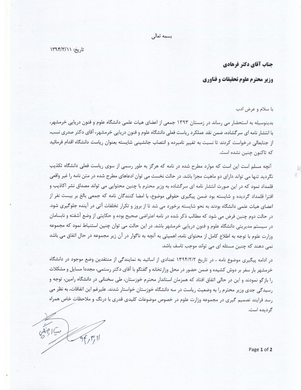 نامه سرگشاده استاد دانشگاه علوم و فنون دریایی خرمشهر خطاب به وزیر علوم : رئیس دانشگاه را برکنار کنید