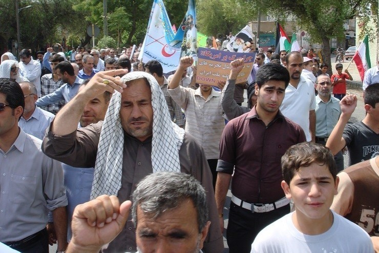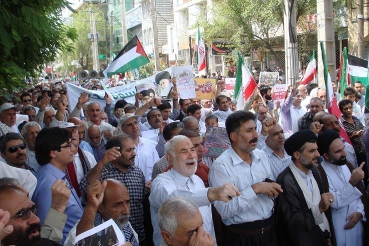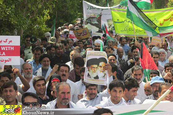 راهپیمایان اندیمشک با شعارهای «مرگ بر اسرائیل»، «مرگ بر آمریکا»،«مرگ