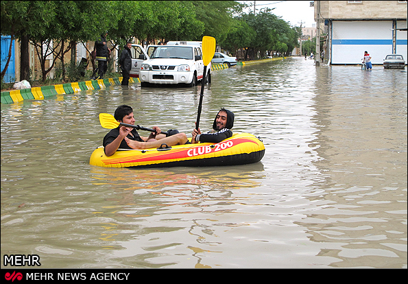 خورنا: قایق سواری در خیابانهای بندر امام خمینی بعد از آب گرفتگی خیابانهای این شهر