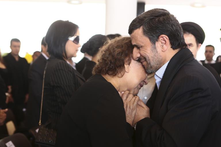خورنا: تصویر منتشر شده از احمدی نژاد در آغوش مادر هوگو چاوز که در مراسم خاکسپاری هوگوچاوز گرفته شده است.